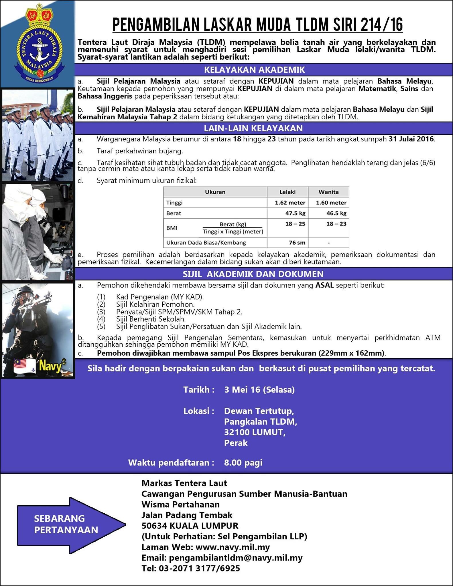 Royal Malaysian Navy On Twitter Pengambilan Perajurit Muda Ptm Tldm Siri 222 20 Bagi Lepasan Spm Svm Dan Lepasan Diploma Kejuruteraan Berminat Menjadi Salah Seorang Dari Warga Navy People Ayuh Sertai Kami Pendaftaran Secara