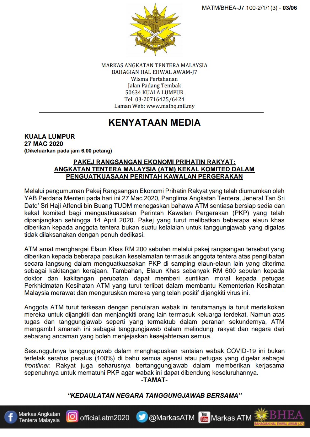 Siaran Akhbar Kenyataan Media Dari Markas Angkatan Tentera Malaysia Facebook